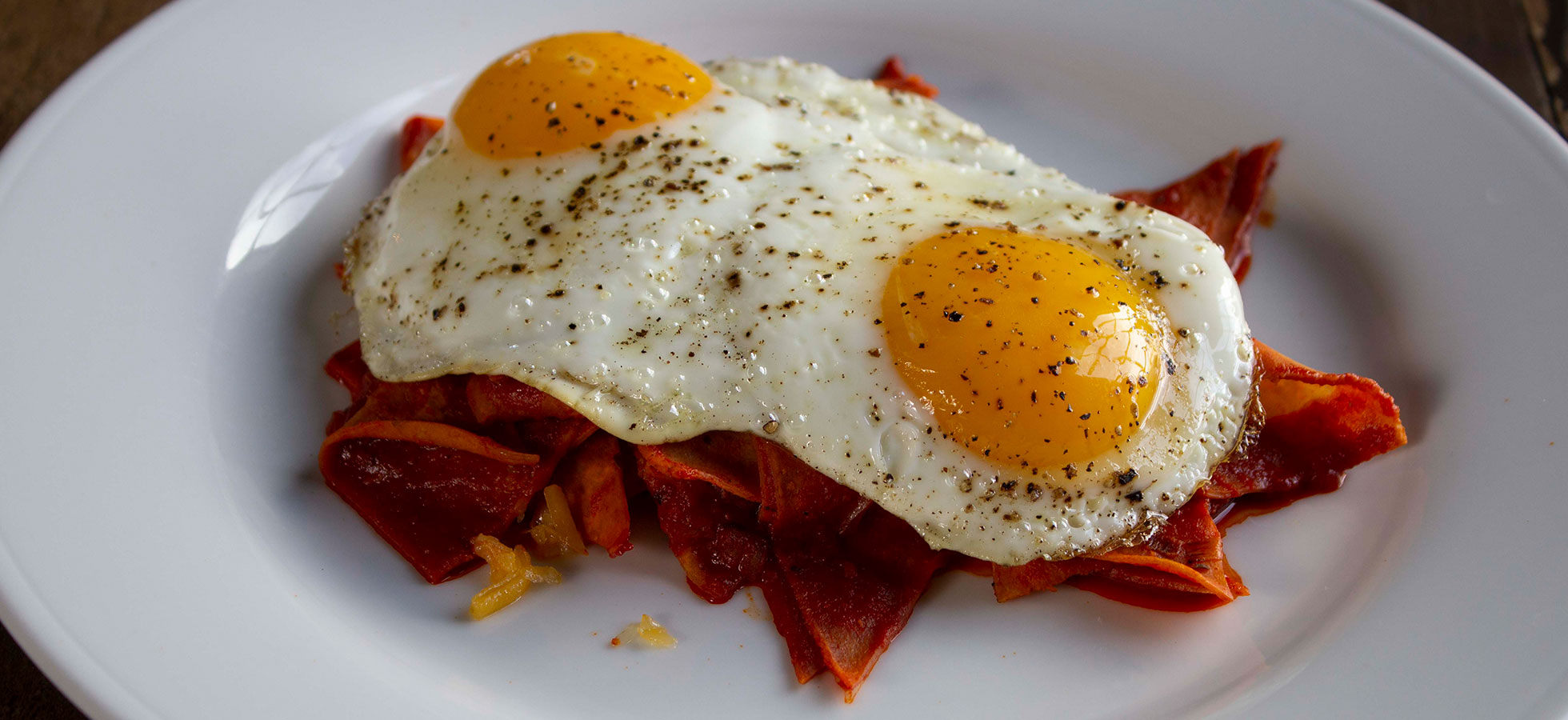 My Pick: Breakfast Chilaquiles (Corn tortillas, house-made red chile, cheddar cheese, onion, cracked potatoes w/herbs de Poblanos, two eggs any style + your choice of meat.)