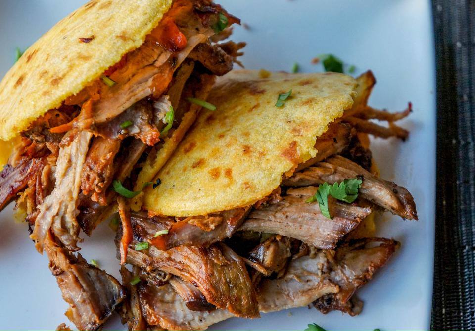 My Pick: The Hot-Pressed Pernil Sandwich with Caribbean-rubbed pork, the Arepa del Perro cornmeal patty and the Sweet Plantains.