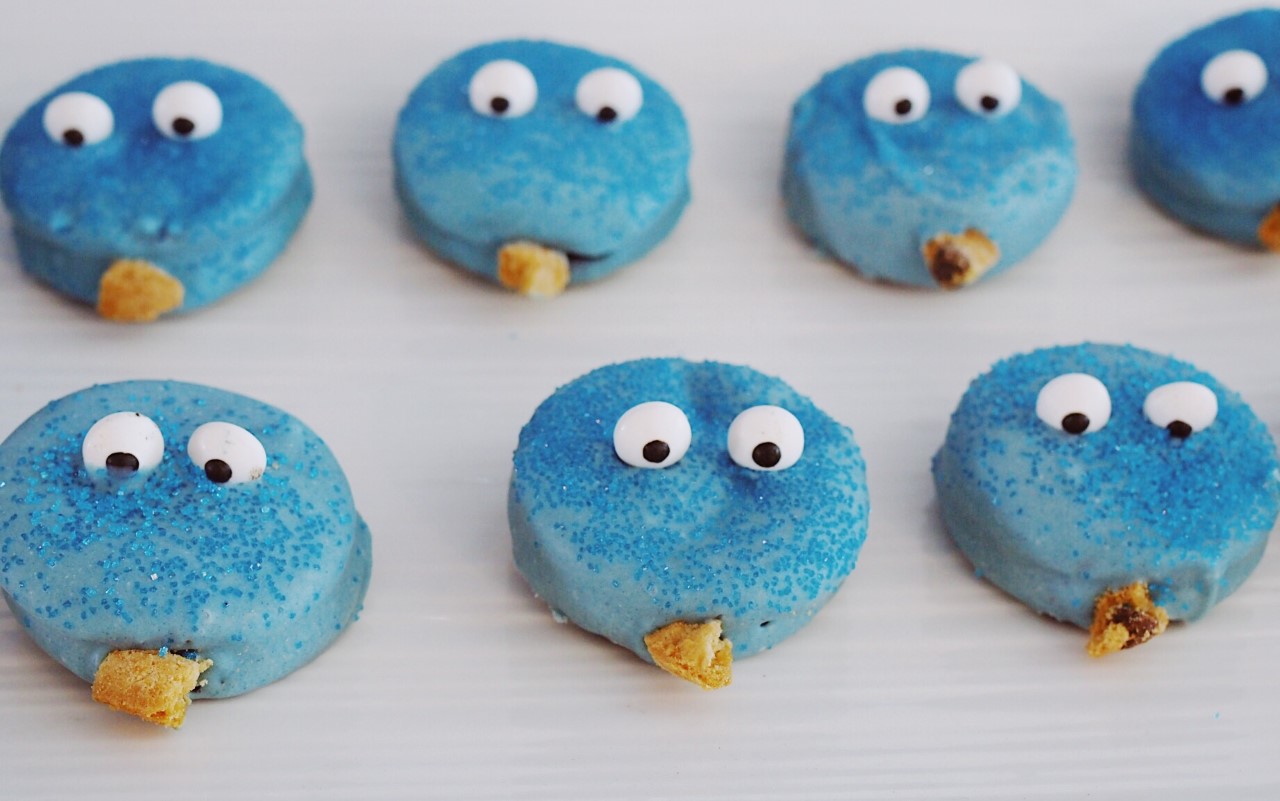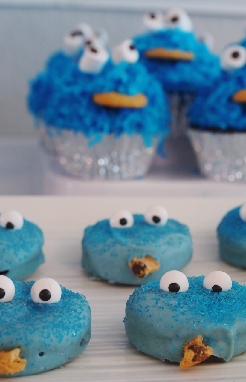 I loved having this little stuffed Cookie Monster “stuck” in a jar, peering down at all of the cookies and treats. We made chocolate chip and walnut cookies, cream filled carrot cake cookies, Snickerdoodles and chocolate covered Oreo Cookie Monster Cookies (I can’t get over how cute and easy those were!)