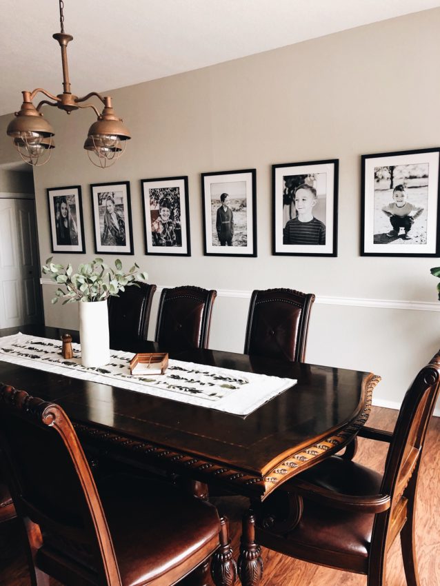 The wall behind this dining table used to be brown with a square, red painting centered on the wall with two small lights on the side. It clashed with the space and left so much of it completely bare.