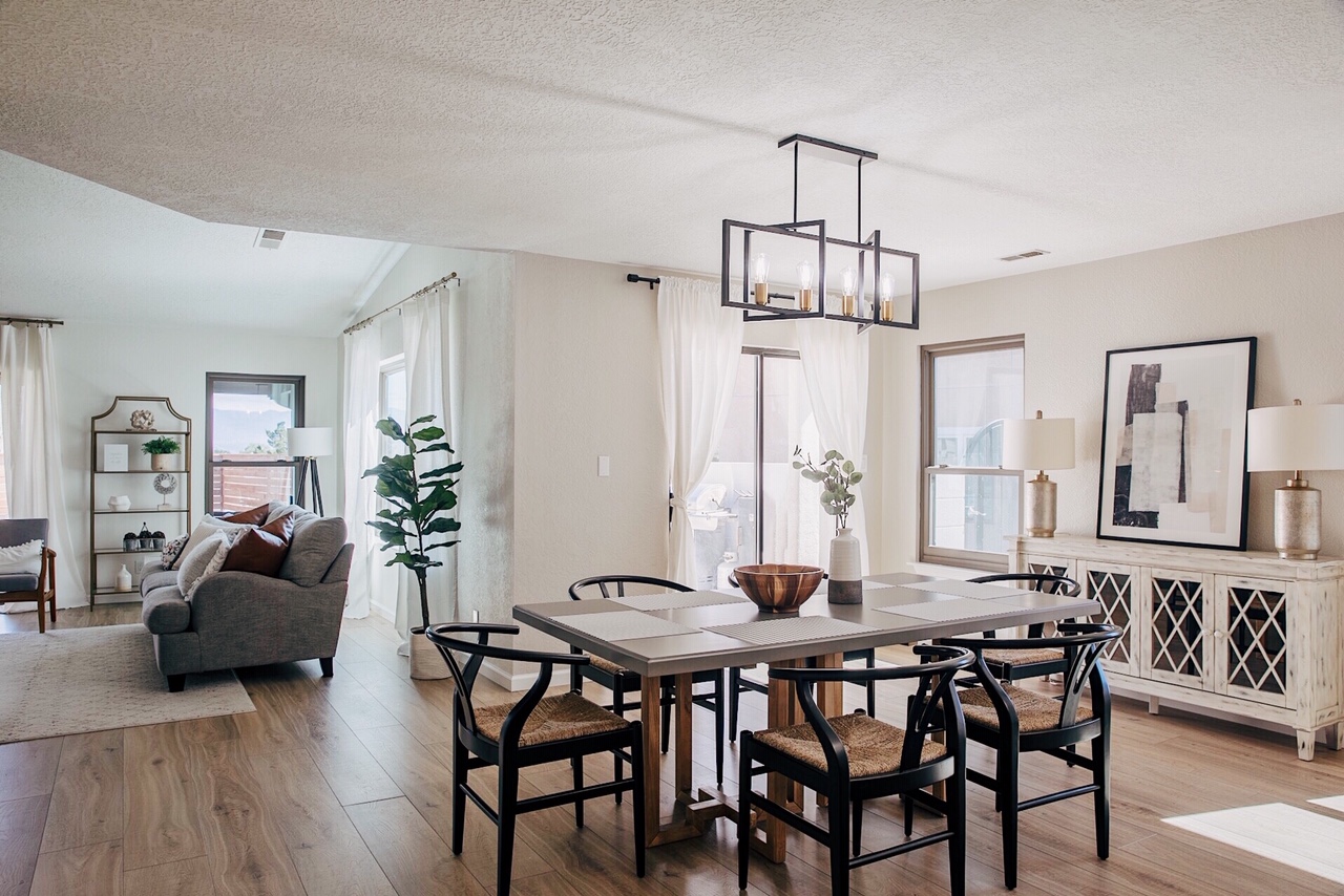 We are so happy to have also worked with our local store in Albuquerque, American Home Furniture, for a ton of our furniture! In the living room, they gifted us with the gray cloth sofa, leather loveseat, moroccan coffee table, the brass etagere and our gorgeous wishbone dining chairs.