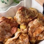 Bake at 425°F (220°C) for 45–55 minutes, depending on the size of your chicken thighs.